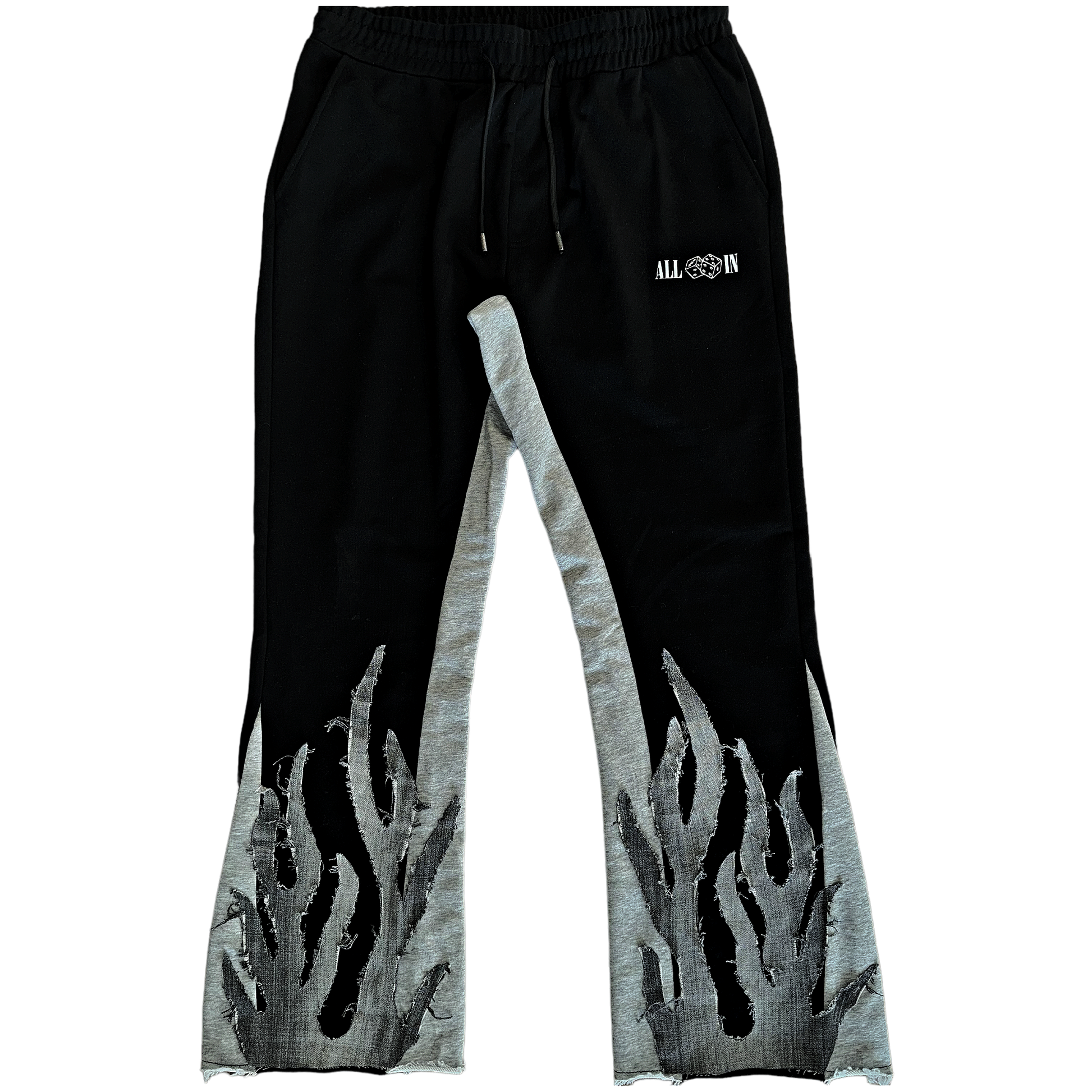 Our Flare Sweats are a sleek way to stay comfortable in style. Crafted from a durable black two-tone grey fabric, these pants feature an eye-catching embroidered flame motif for a unique touch. Perfect for everyday wear.