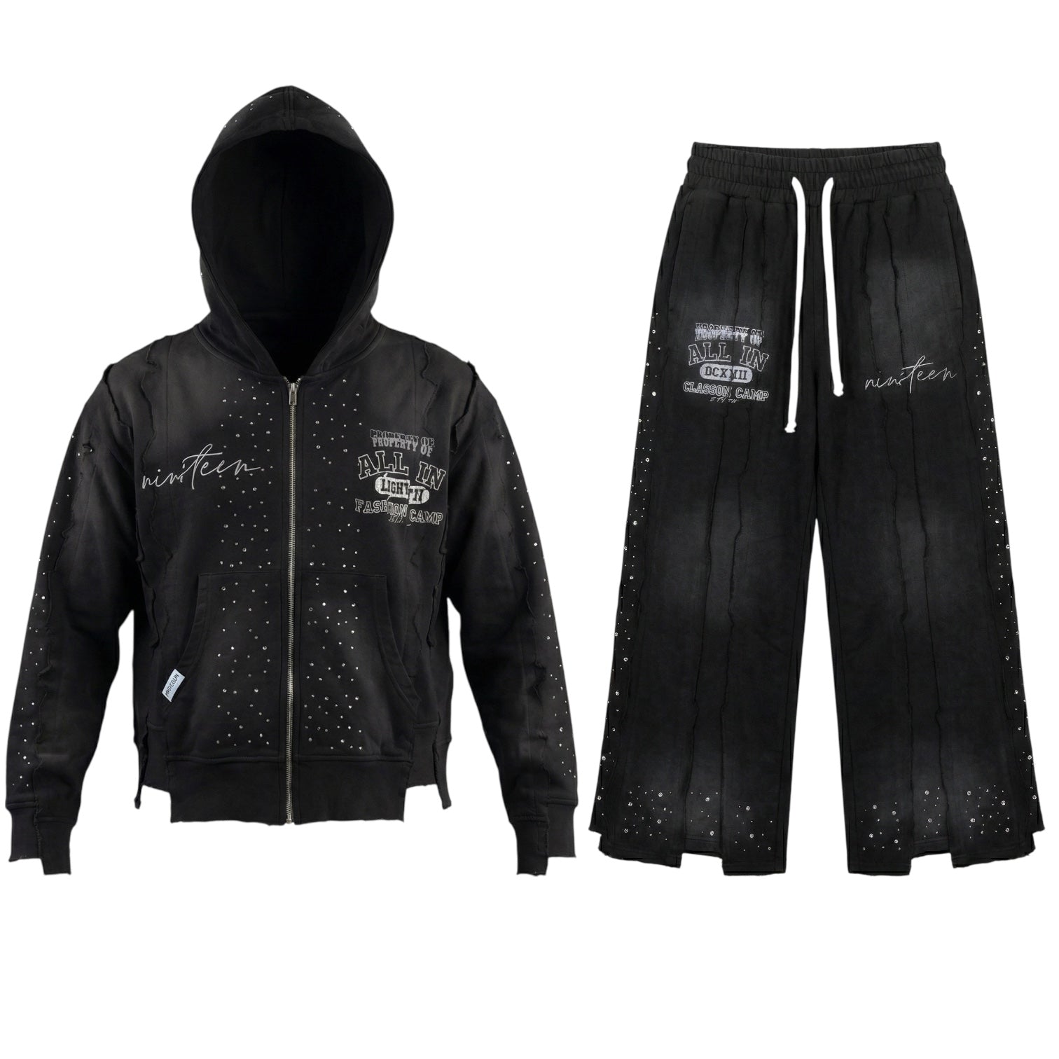 Expertly designed for both style and comfort, this black sweat suit features unique splice split distressing and sparkling rhinestones. With its sleek design and attention to detail, you'll feel confident and fashionable while staying cozy. Upgrade your everyday look with this must-have piece.